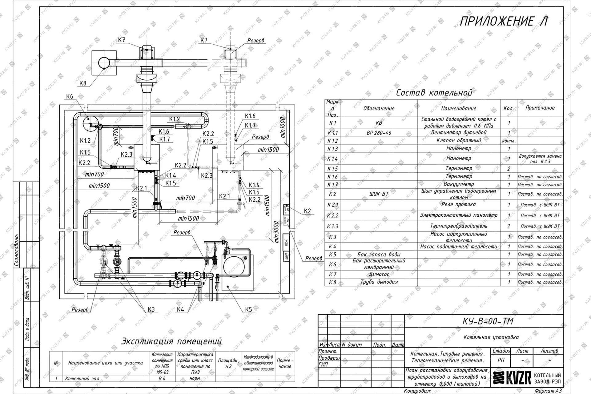 Чтобы правильно подключить котел КВ-0.3 без дымососа на самотяге в котельной необходимо оставить проемы для обслуживания оборудования во время эксплуатации. На представленной здесь схеме указаны их минимальные размеры. Кроме того, в данной примерной схеме монтажа водогрейных котлов и оборудования указан перечень минимально необходимого вспомогательного оборудования для правильной работы котла.