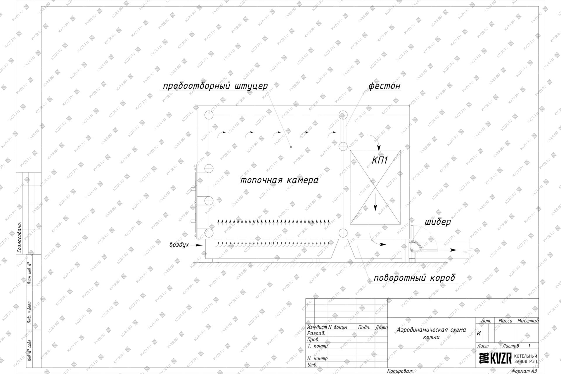 Воздух в водогрейный котла на дровах 230 кВт на дровах подается вентилятором поддува через топочный короб под слой древесного топлива для обеспечения горения. На боковой панели топки котла имеется пробоотборочный штуцер для подключения манометра и тягонапорометра.